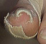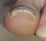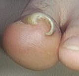 足の爪が横方向に曲がっている状態が巻き爪(まきづめ)。爪の角がトゲのように軟部組織(肉)に刺さって炎症を起こす状態が陥入爪(かんにゅうそう)です。 |